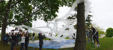Inspired by tape-lace crochet, CDR's pavilion uses recycled plastic cups bound by zip-ties to form a densely-knit serpentine structure. A lacy infill of cups between the tape structure and branches of the trees creates an outdoor room. The “Governor’s Cup” Pavilion will be assembled on the island in the spring of 2014 and be on display all summer long.