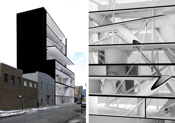The final plans involve cutting through the tensegrity in precise positions according to scenarios investigated in collaboration with curators, artists and systems analysts. As opposed to programmatic evolution vis-à-vis space planning, the network of tubular joints acts as an armature for the museum to expand like coral along the circulatory loop. Thus, the proposal is not only an analogy, but a developing system that directly responds to the programmatic demands of new media display and experimentation.