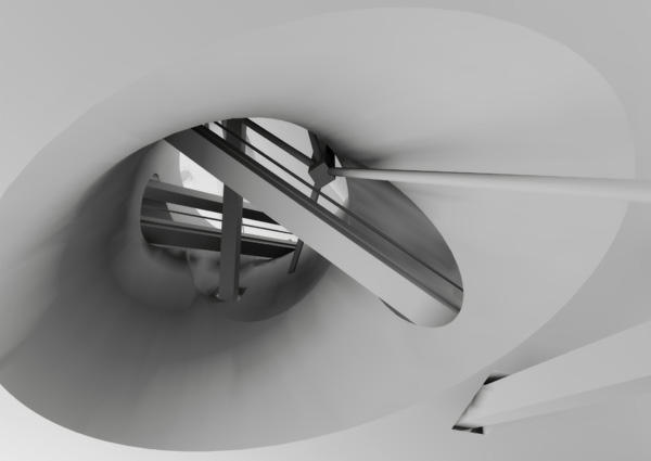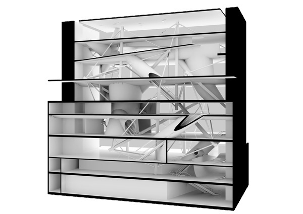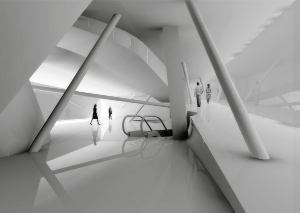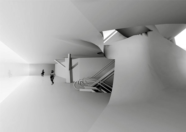 The Museum of Art and Technology design aims to exemplify and inspire unprecedented applications of information technology. Symbiosis of digital media and architectural space results in a kind of cat's cradle situation: reciprocal elements bound in tension. Two seemingly separate horizontal spaces are toggled such that each appears to be an extraordinarily thick mass from which the other is carved. The structural system is based on mathematical theories of tensegrity, a force field of separate compression members held apart by cords in continuous tension.